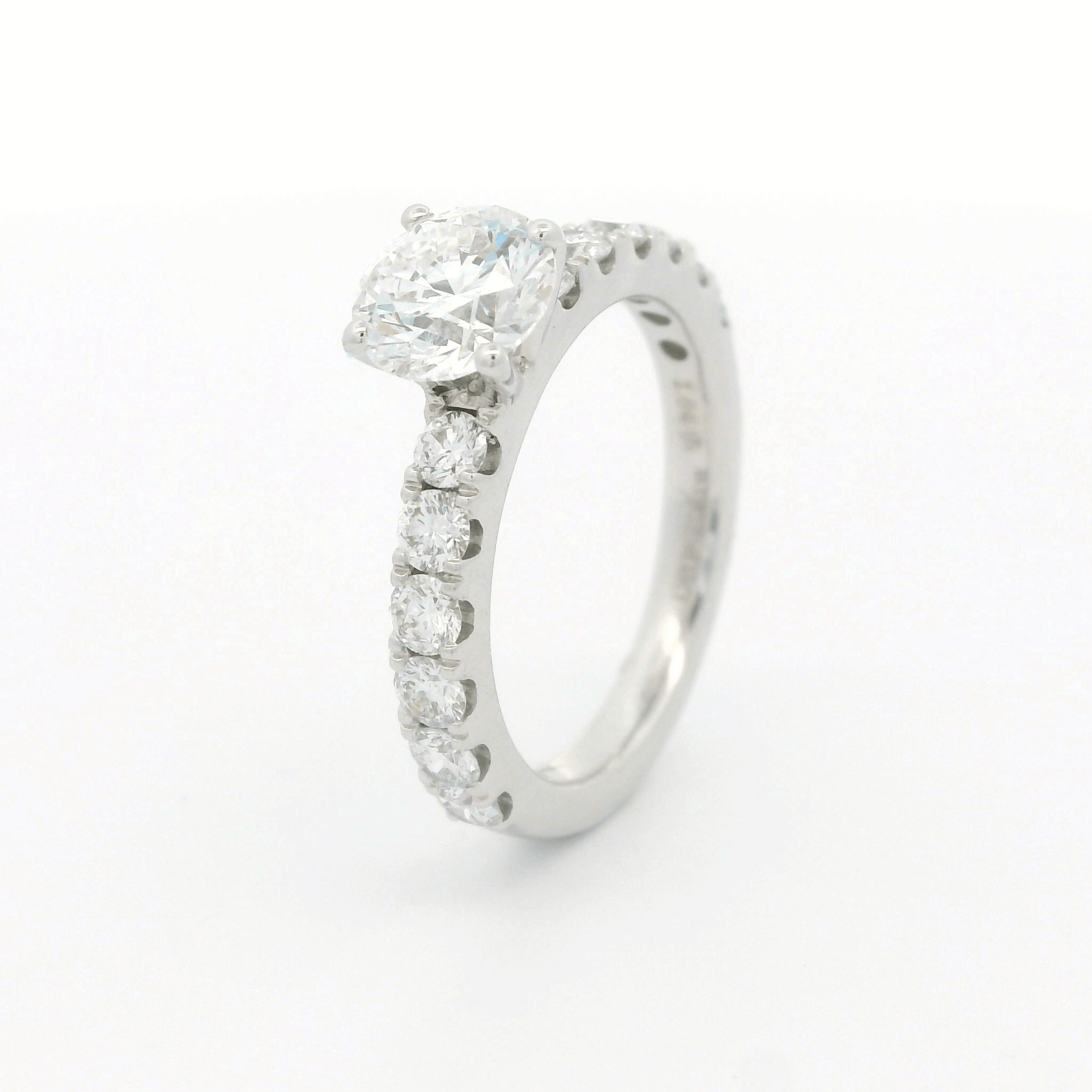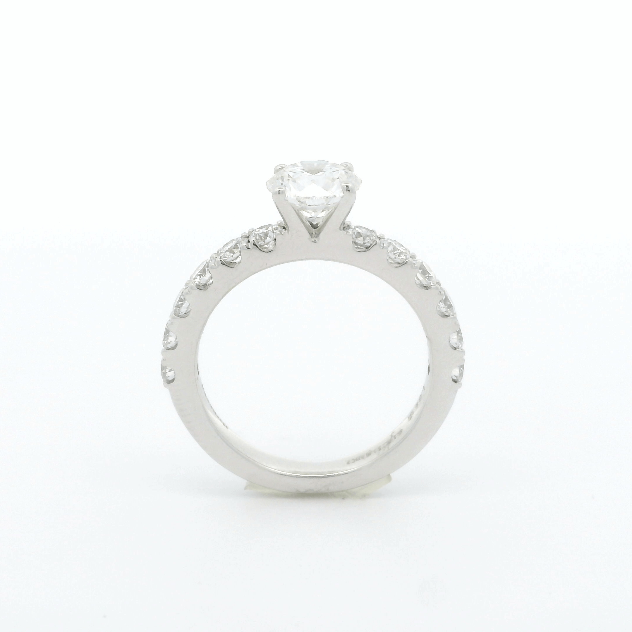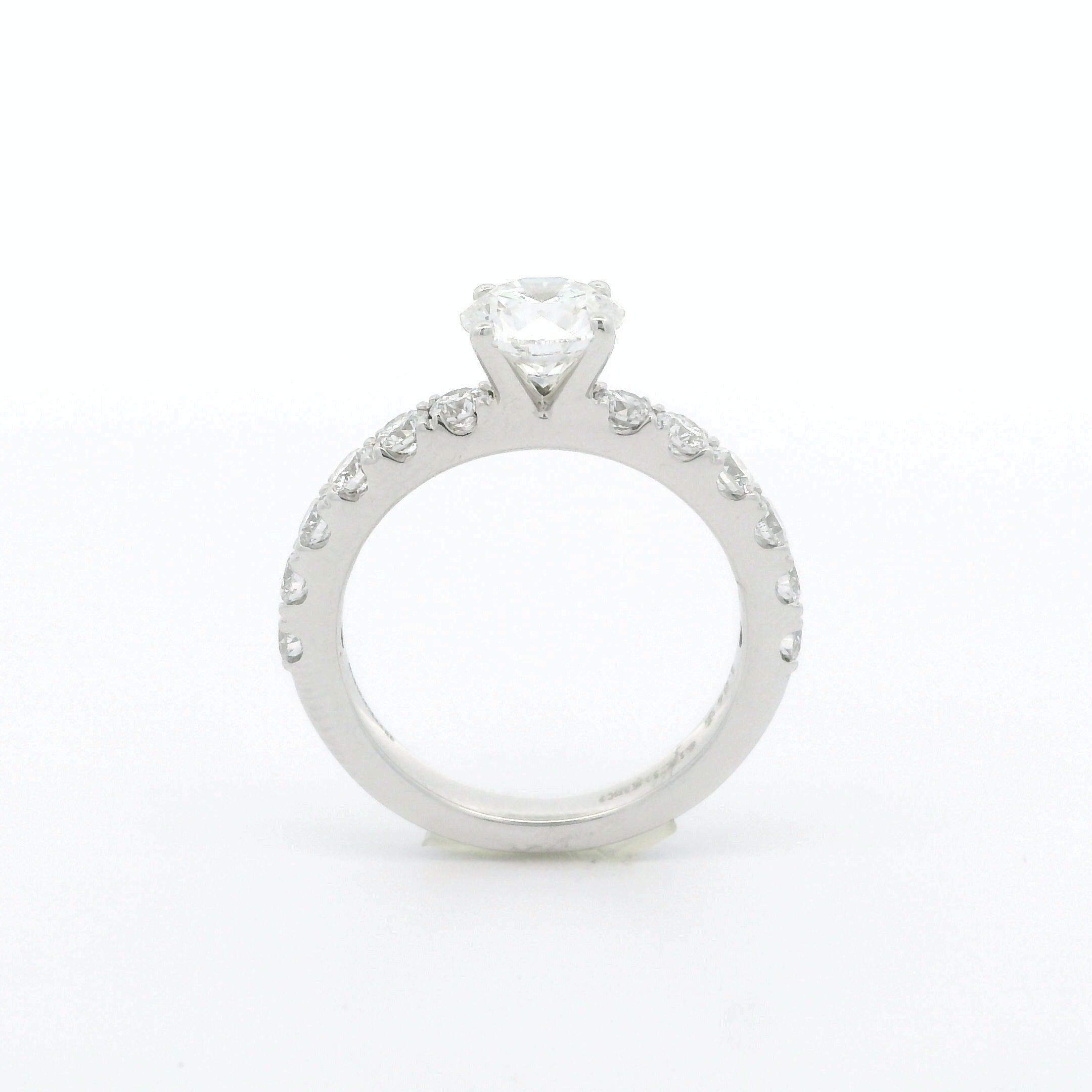 This stunning diamond solitaire ring features a brilliant round center stone, surrounded by a delicate band adorned with smaller sparkling diamonds. Its timeless design makes it the perfect symbol of love and commitment, ideal for that special moment.