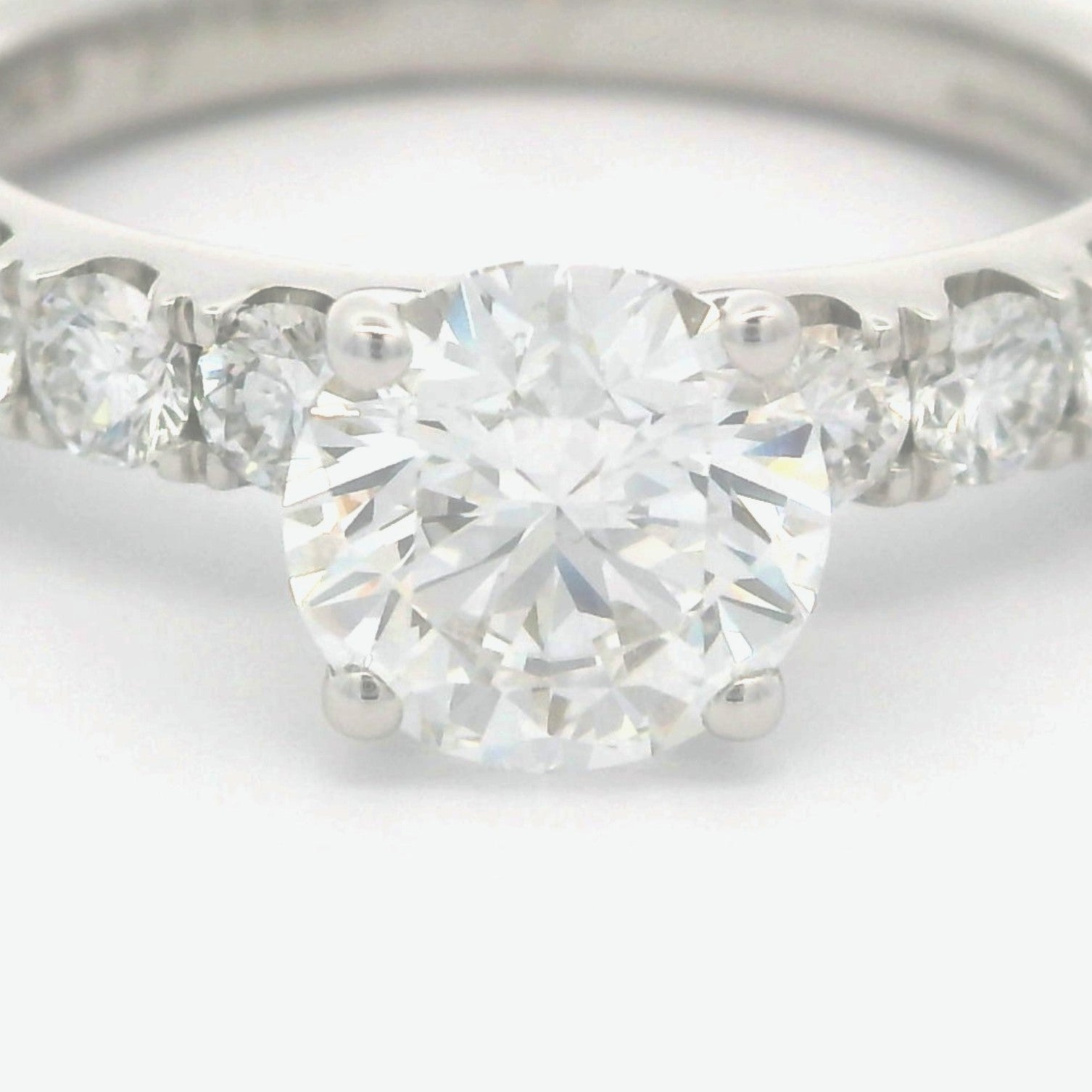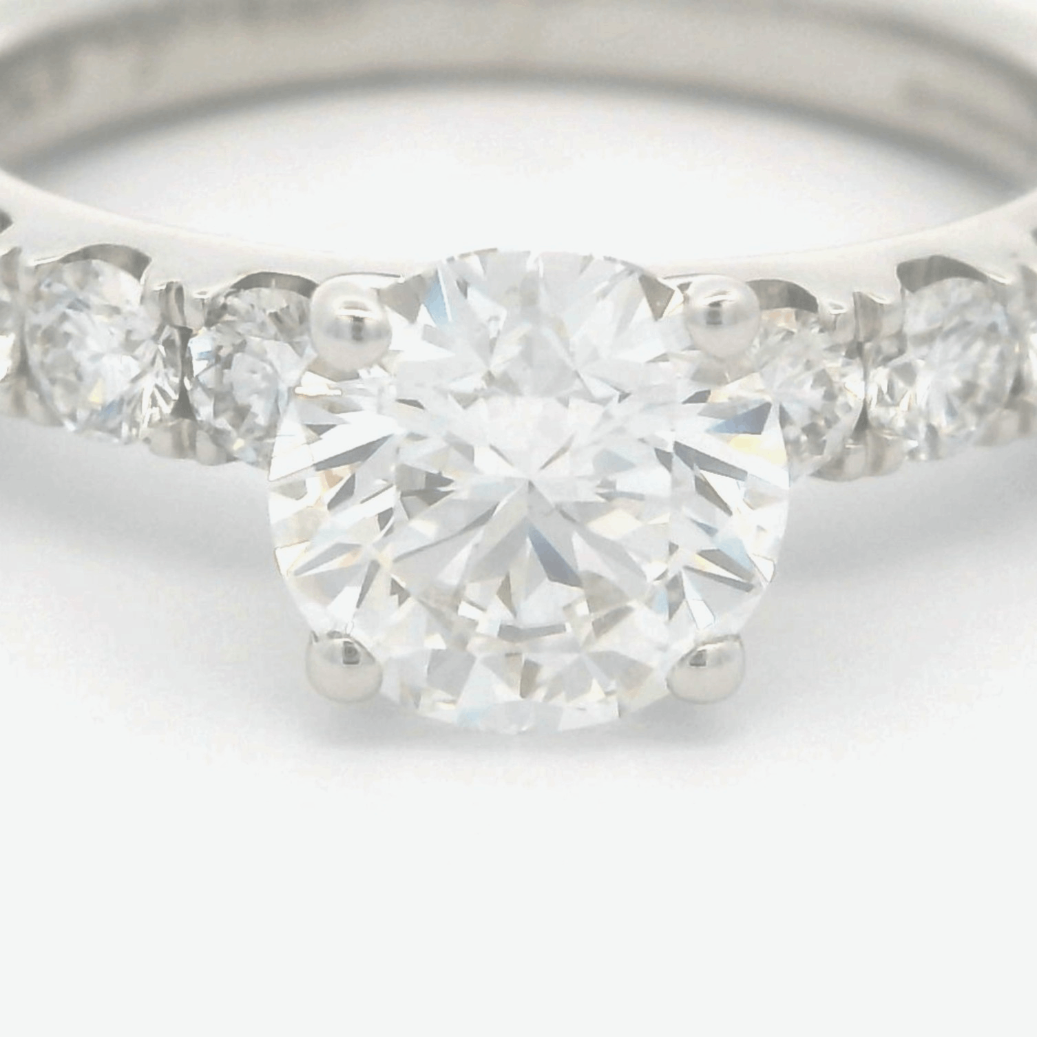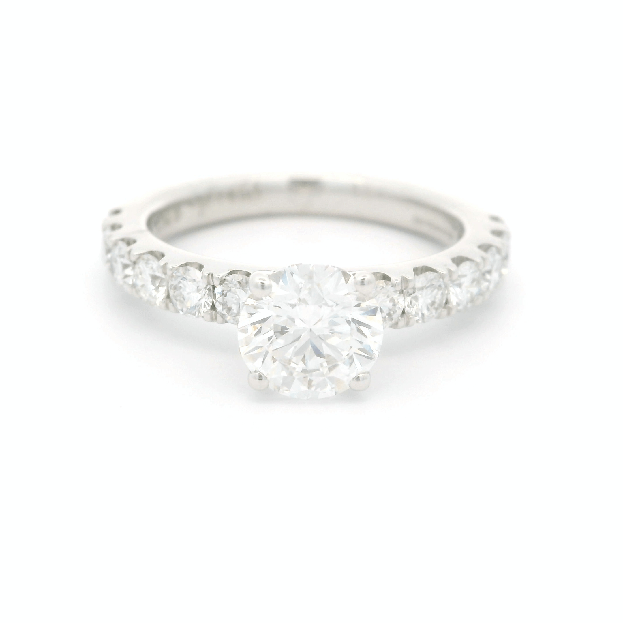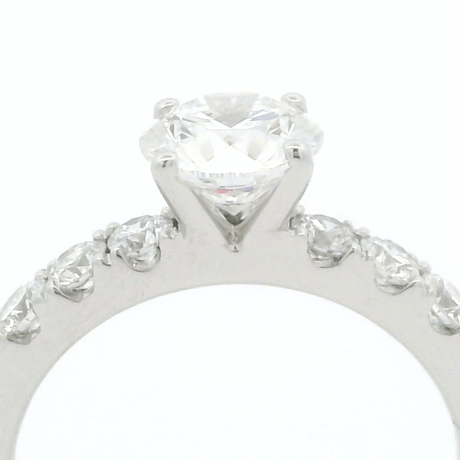 This stunning diamond solitaire ring features a brilliant round center stone, surrounded by a delicate band adorned with smaller sparkling diamonds. Its timeless design makes it the perfect symbol of love and commitment, ideal for that special moment.